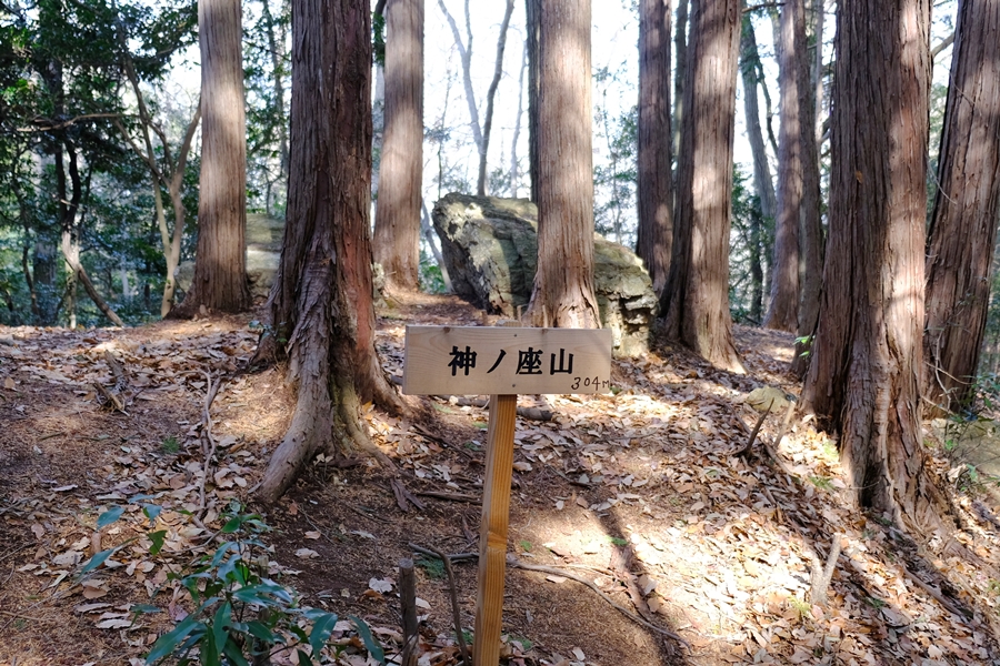 大高取山に登りながら、疲労困憊と空腹に勝てずに神ノ座山の石に腰かけて昼飯を食う。
