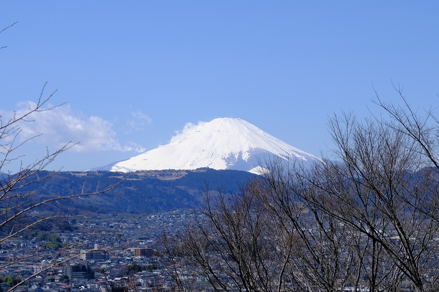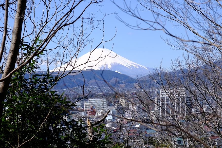 階段途中で振り返ると樹間から富士山が見える。木が邪魔だな!