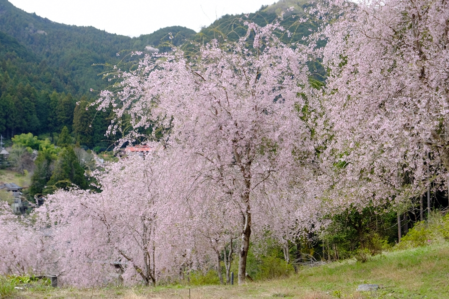 ヤマザクラが数本まとまって咲いている。のどかな風景
