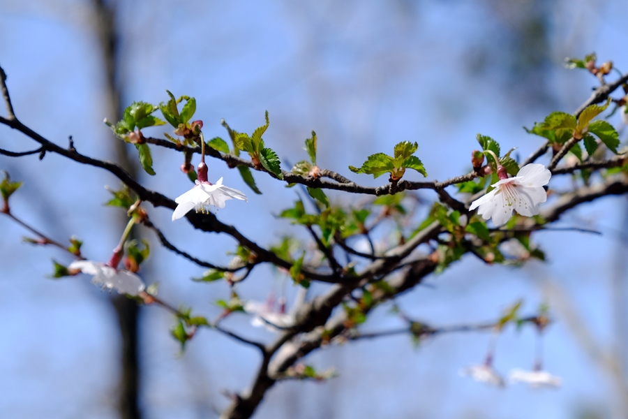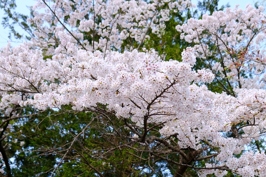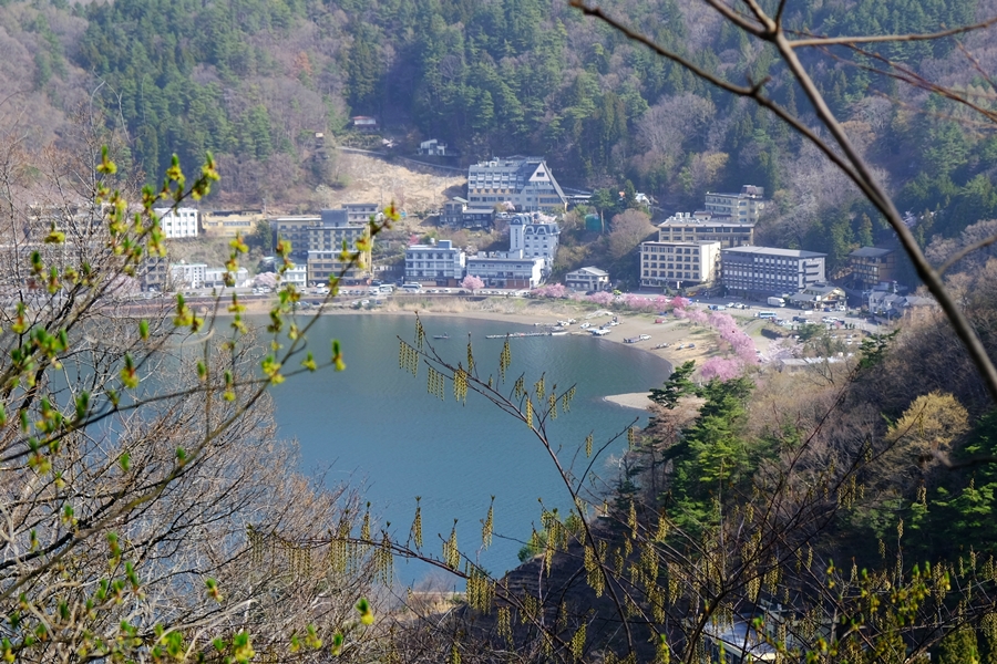 出発地点の河口湖畔船津浜駐車場近くには満開の桜が