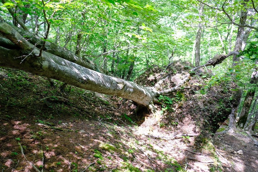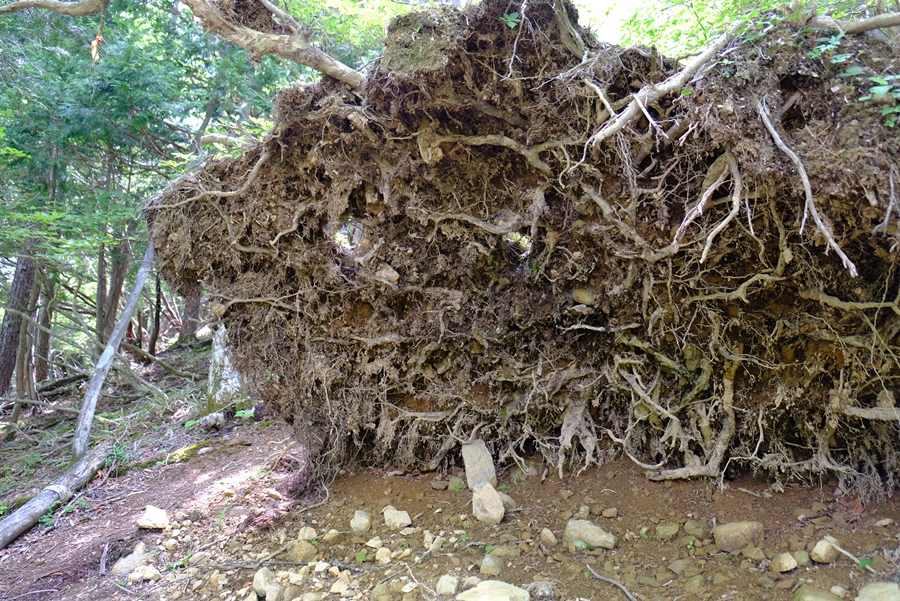 登山道をふさぐ位置に倒木の根っこ