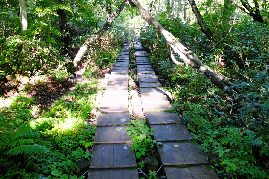 舗装路から木道の道に入る。濡れてて滑りそうだ