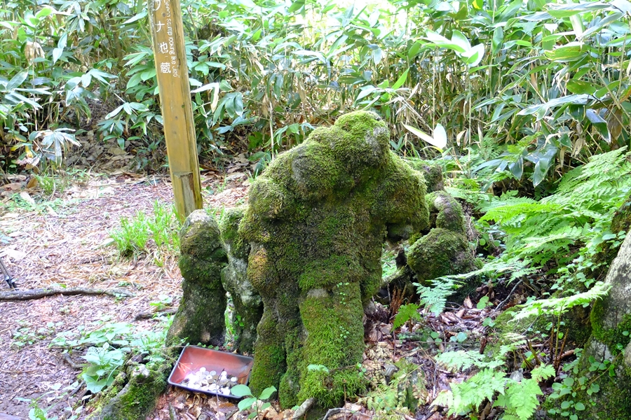 ブナ地蔵と言われる場所に到着。枯れたブナの木が苔むしてまるでお地蔵さんが並んでいるようだ