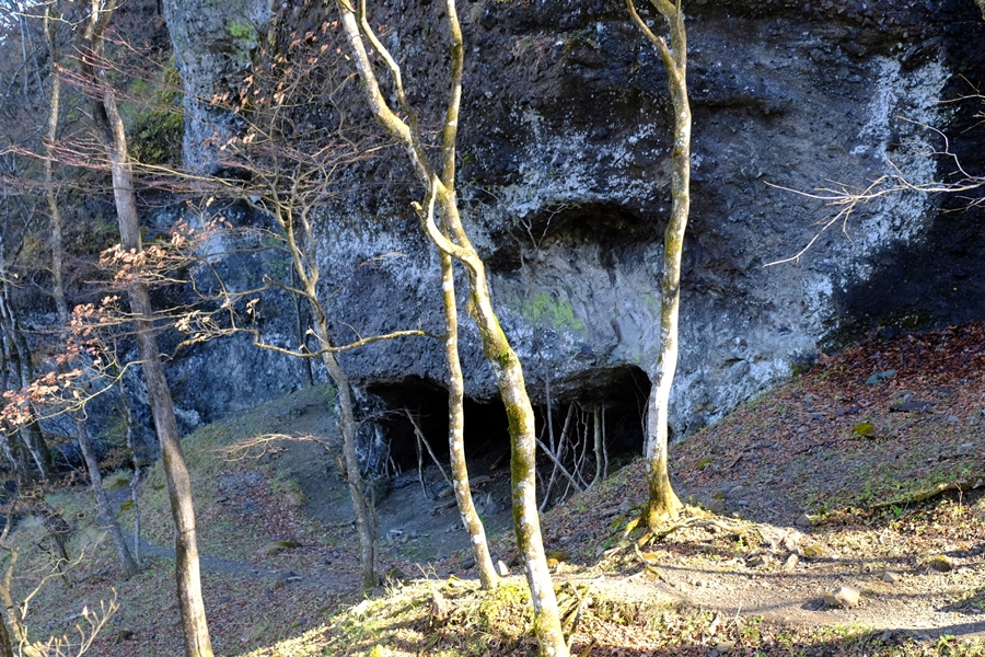 歩き始めると遠くに艫岩が木々の間から見え隠れする