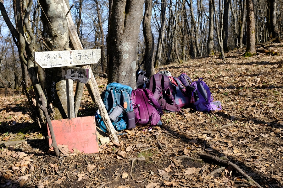 星尾峠到着、ここで仲間のデポした荷物を留守番