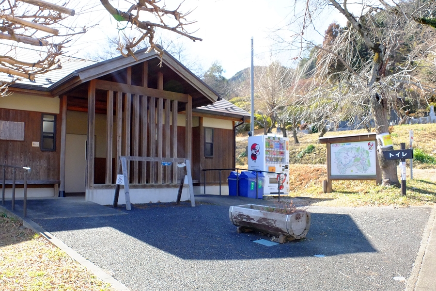 公園出口にはトイレなどの設備が充実している