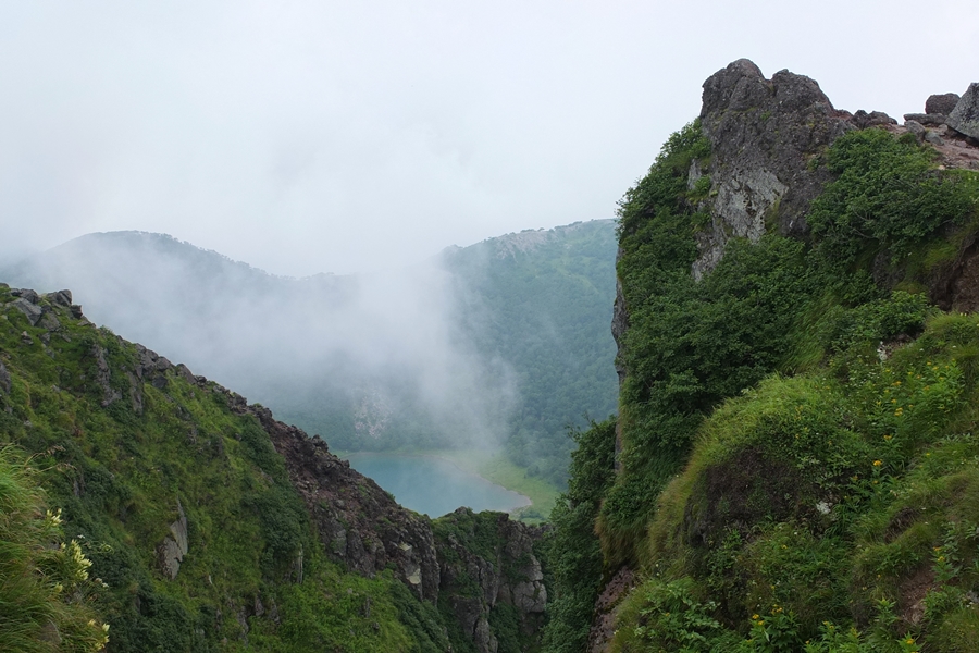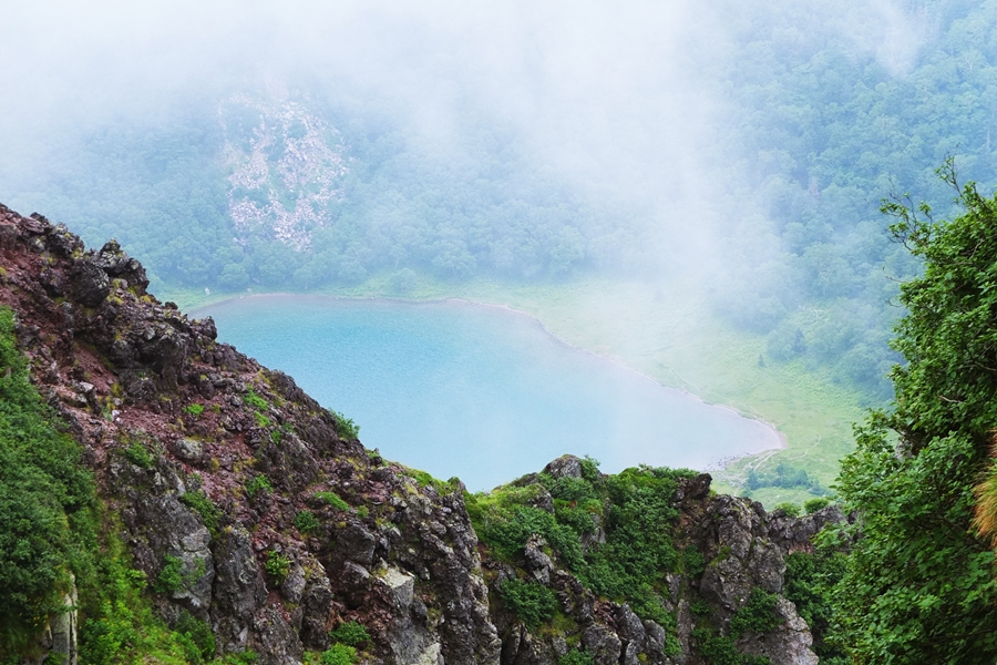 11時40分山頂真下で五色沼が見えた。(他の景色はガスの中で見えず)