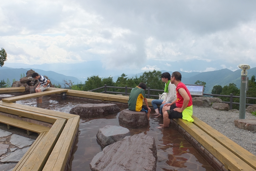 14時30分近くの天空の足湯で、山頂で撮れなかった集合写真を撮る。