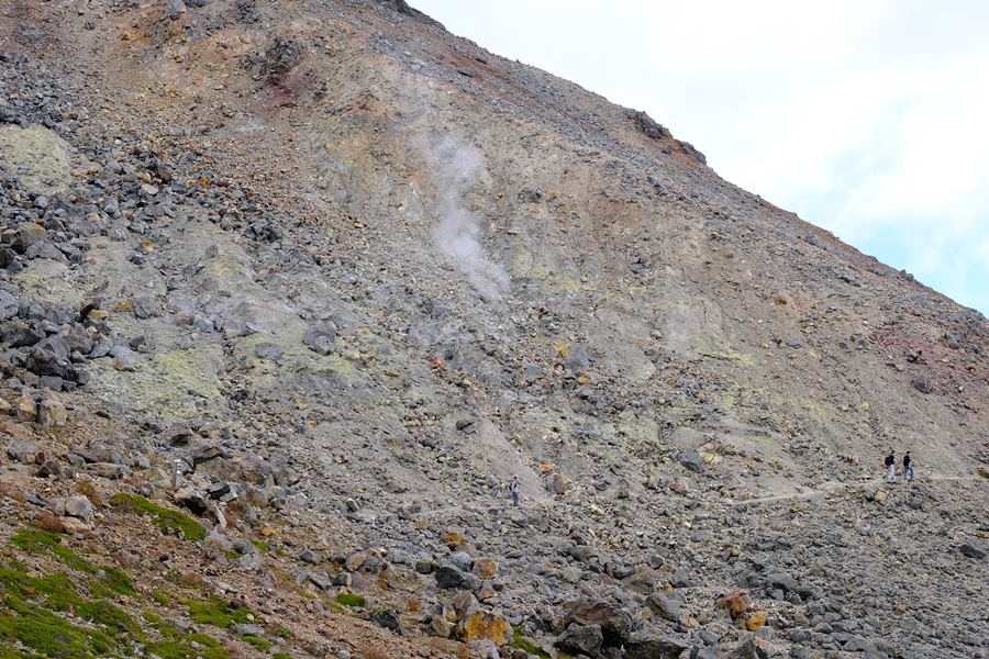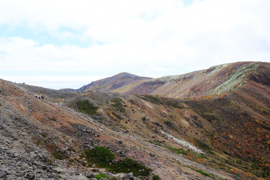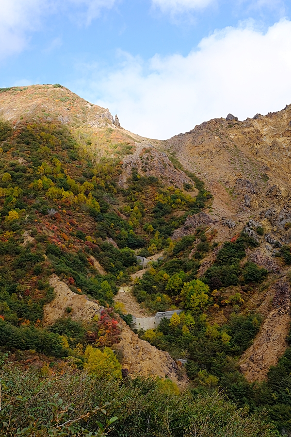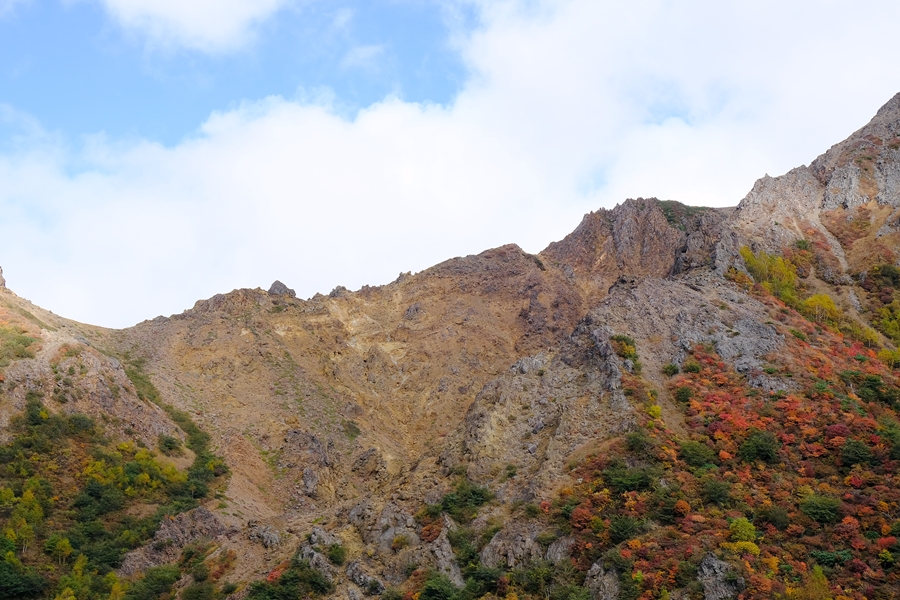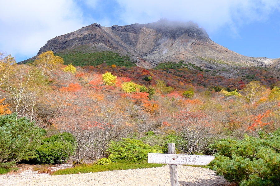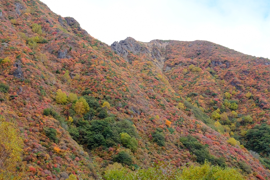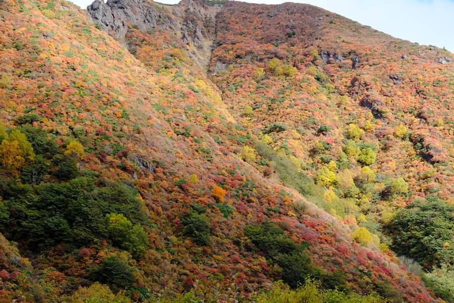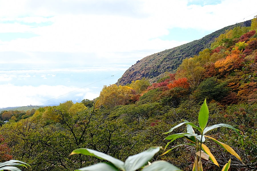 真っ盛りと言ってもいい紅葉と火山のコントラストを楽しめた。