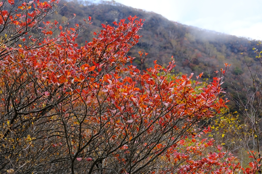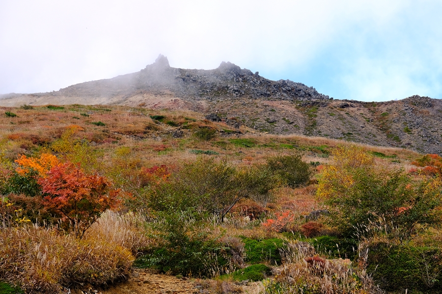 茶臼岳方面を仰ぎ見る。手前は色付き最高潮だがガスが流れている