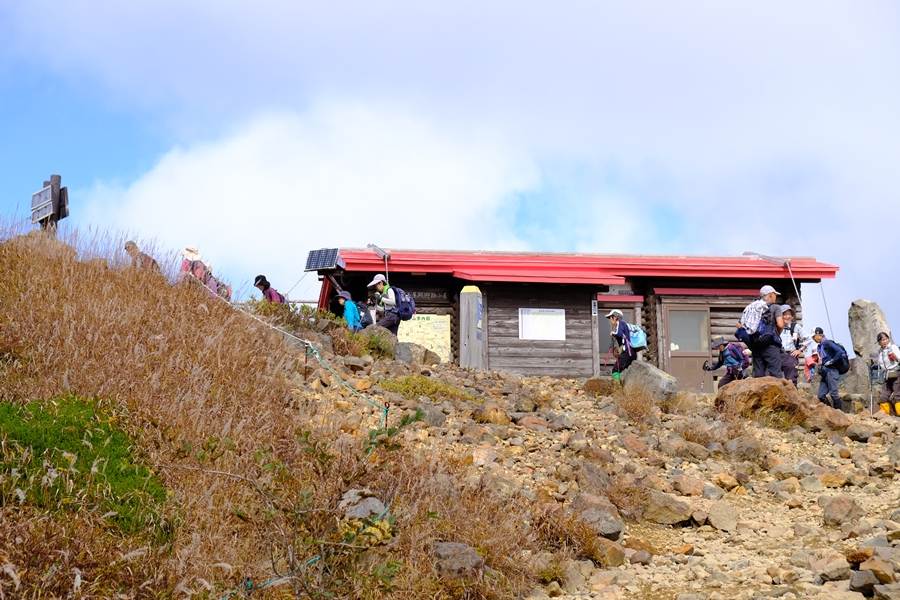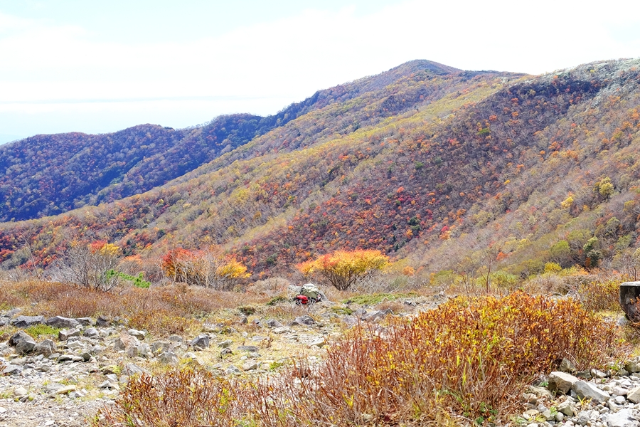他に二人同じように待機しながら付近の紅葉や朝日岳方面の荒々しい風景を楽しんだ後、アタック組の帰還を待ってから牛ヶ首へと移動そこで昼食を摂り、姥ヶ平へ降りて沼ッ原湿原へ向かうコースを歩いた。