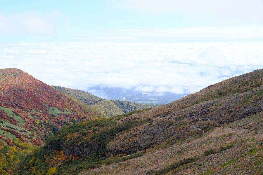 少し登ると、雲海と山肌の紅葉が見えるようになる