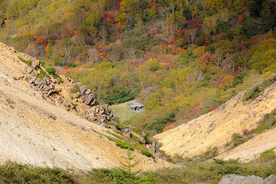 谷底に避難小屋が見えた