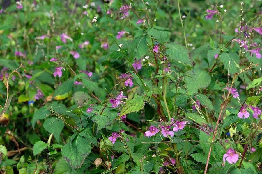 歩き初めから道端にツリフネソウがたくさん咲いています。
