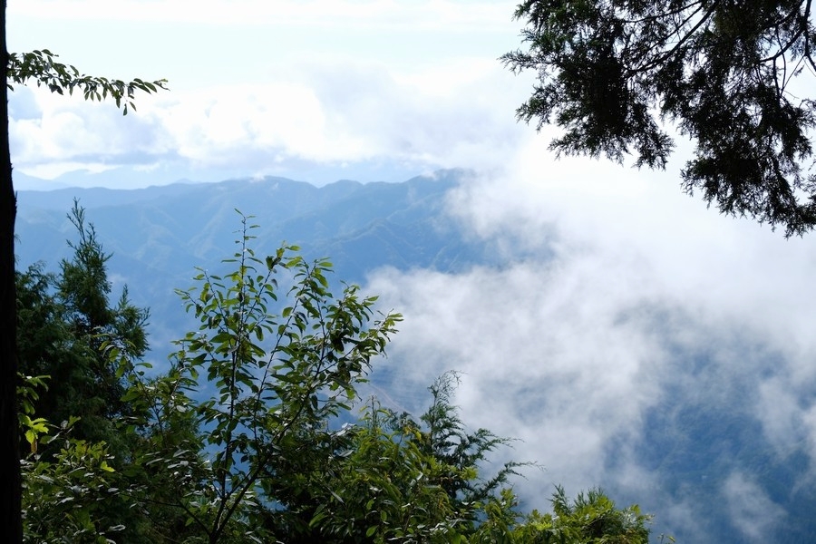 9時10分、林の間の見晴台で、ほんとは富士山が見える場所だが雲が湧いて見えない。