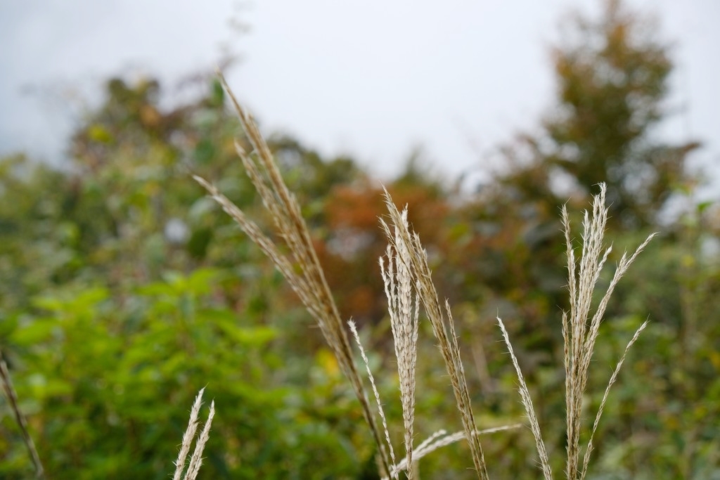 すすきの先にボケた紅葉を入れてみた。