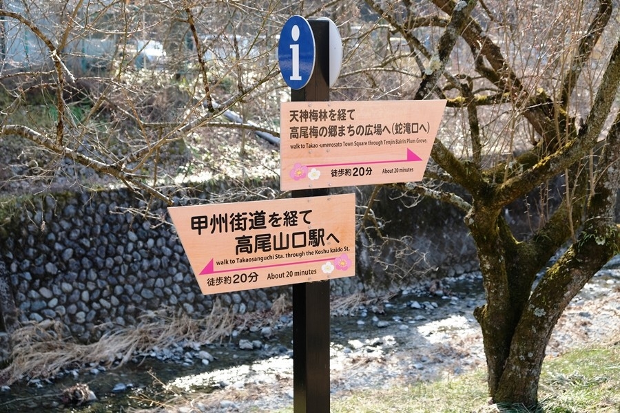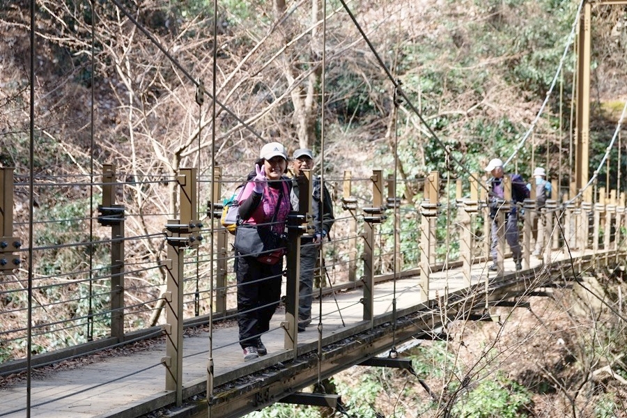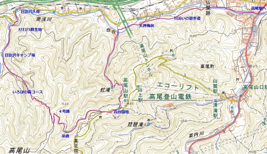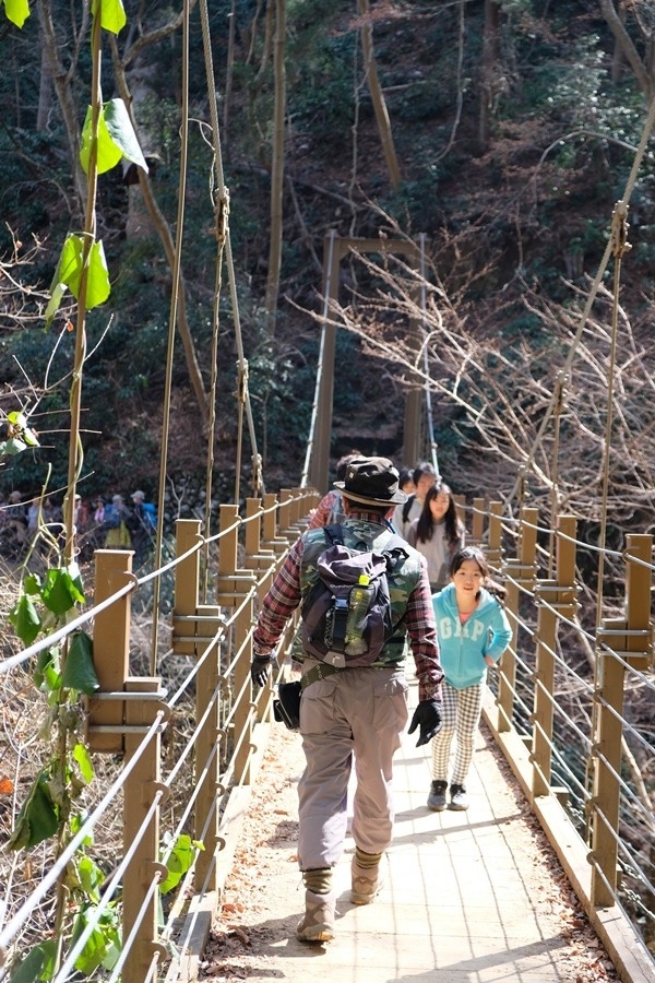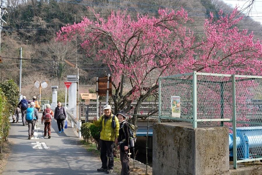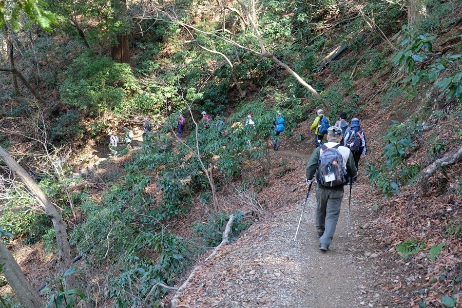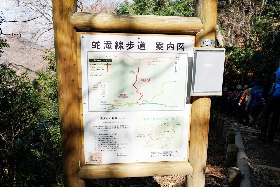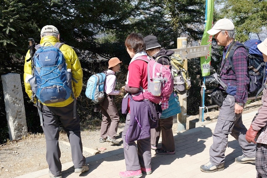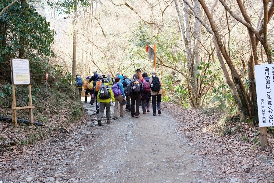 コースは高尾駅→バス→日影下車、日影沢キャンプ場→いろはの森コース→4号路→霞台園地(昼食)→蛇滝コース→蛇滝→天神梅林→川沿いの遊歩道→高尾駅