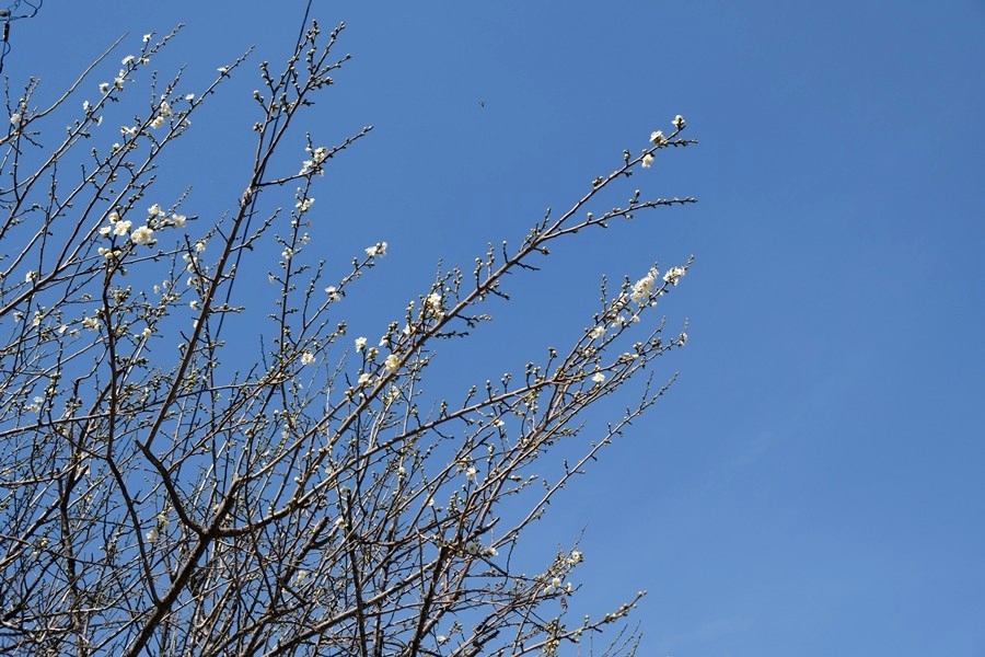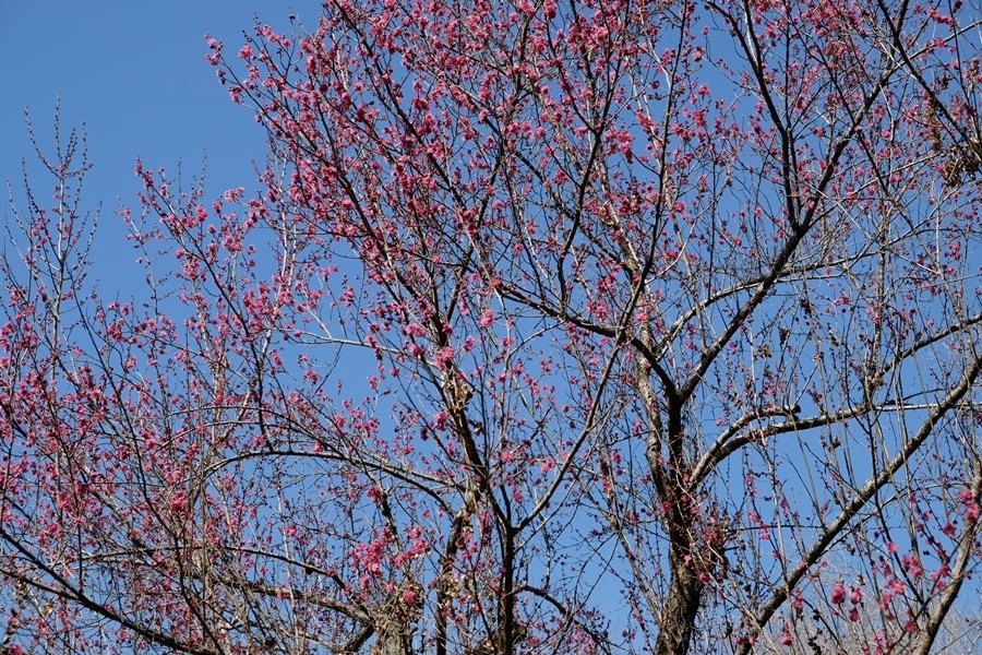 川沿いの遊歩道も終わりかけたところで紅梅のよく咲いた所を見つけて念願の花見をやります。