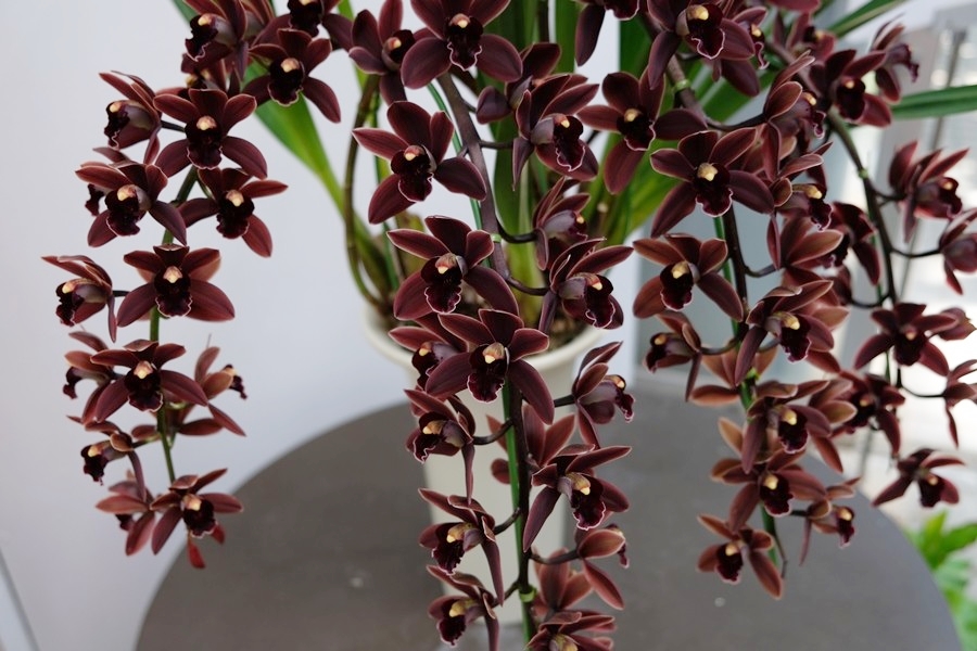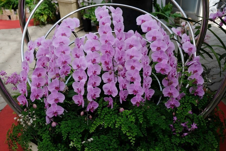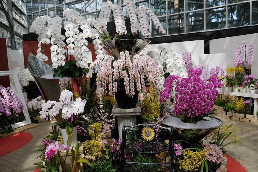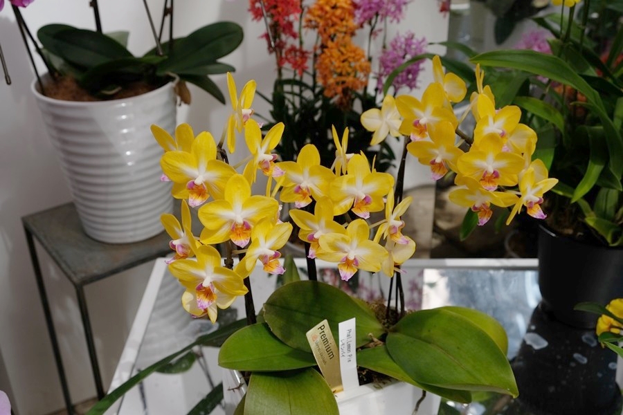 胡蝶蘭がいろいろな色でたくさん飾られている。