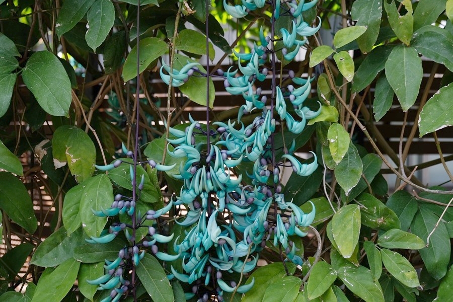 閉ざされた門扉の間から中の寄せ植えを一枚