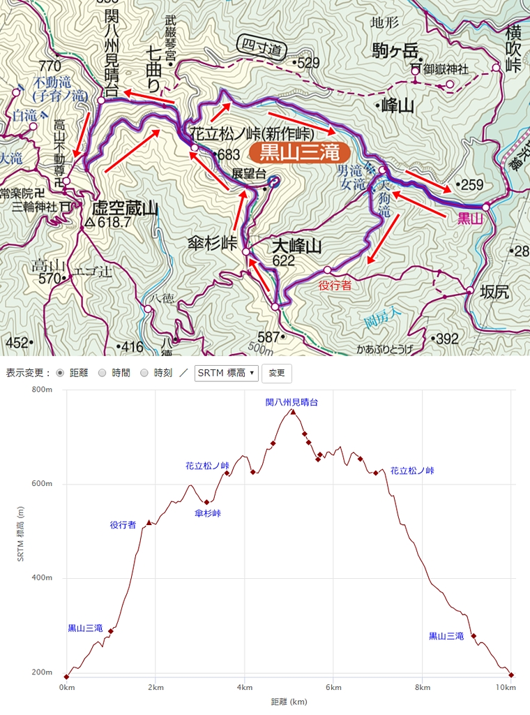 コースは天狗滝~役行者・傘杉分岐~役行者像~顔振峠・傘杉峠分岐~傘杉峠~花立松ノ峠~関八州見晴台~