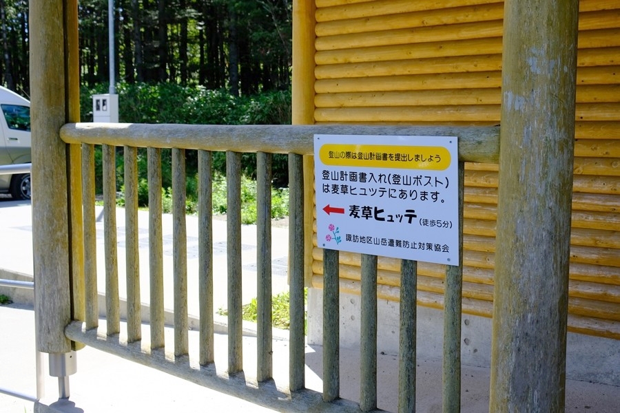 駐車場のトイレ前には、麦草ヒュッテへの案内がある。