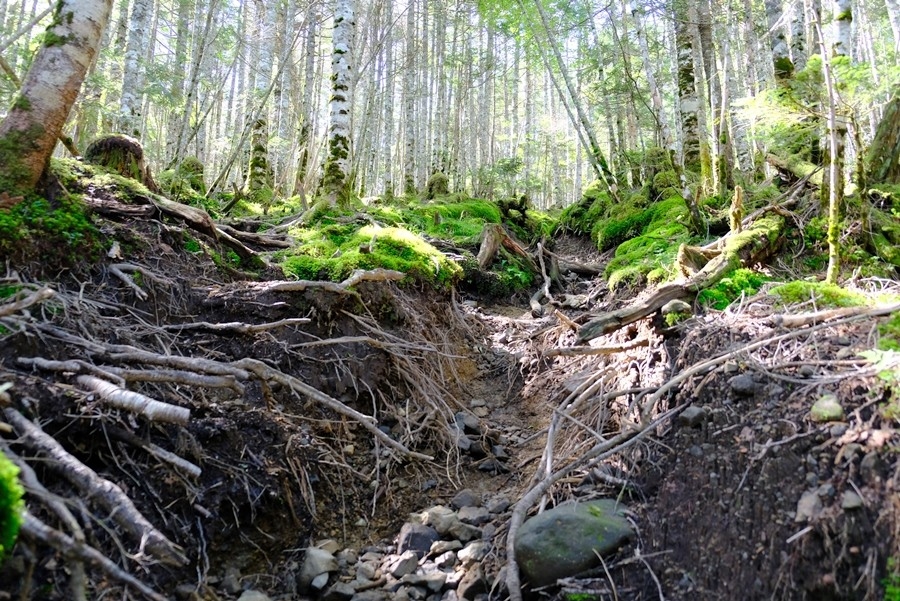丸山に登った角度と同じ角度で白駒池へ降りていく。