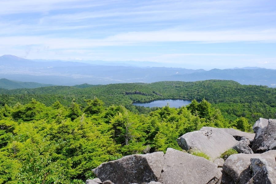 石の上からこれから向かう白駒池と付近の山々が一望できた。