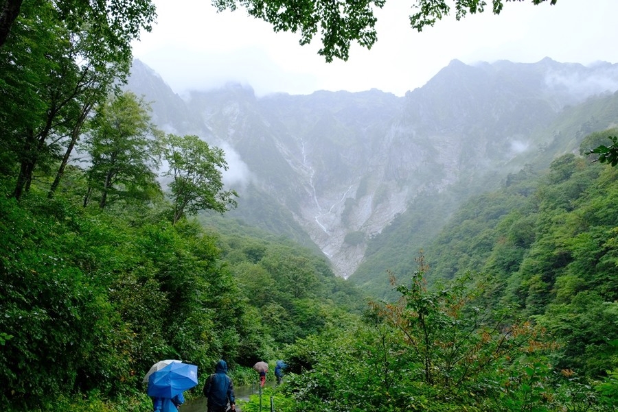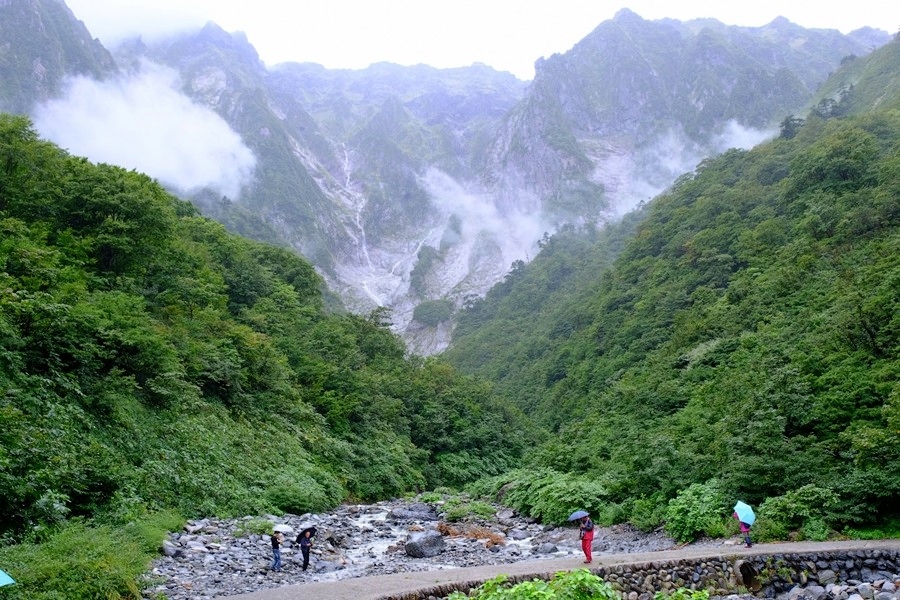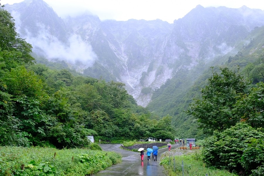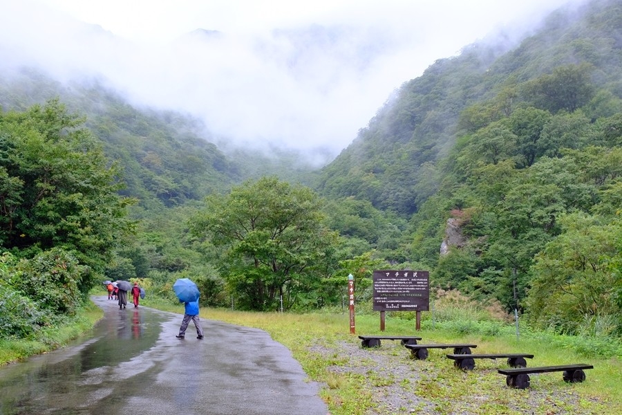 場所を借りて、雨用服装に着替えて一ノ倉沢トレッキングコースに向かう。9時20分
