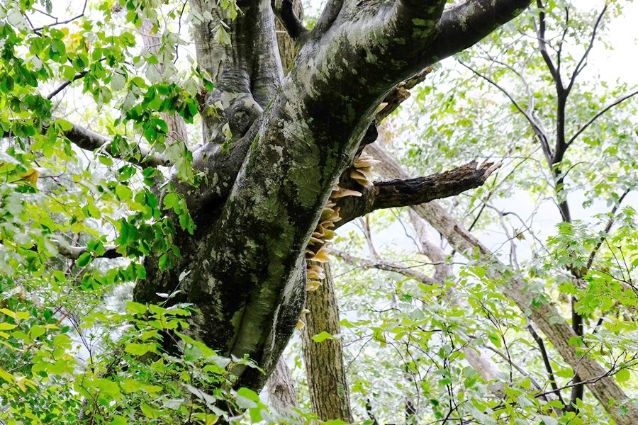 折れたブナの木に大量のきのこが生えていた。