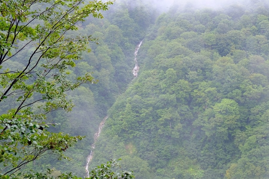 右手に山の上から続く滝のような流れを見る。