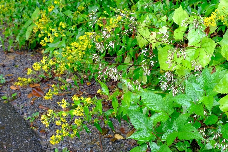 アキノキリンソウと白い花のコントラスト