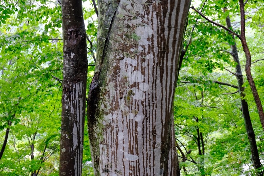 雨の通り道模様なのか?、シマウマみたいなブナの幹模様