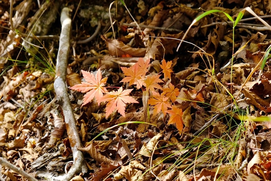 あまりに苦しいので、下ばかり見てヨロヨロ登る途中で地面に生えたような楓を見つけた。