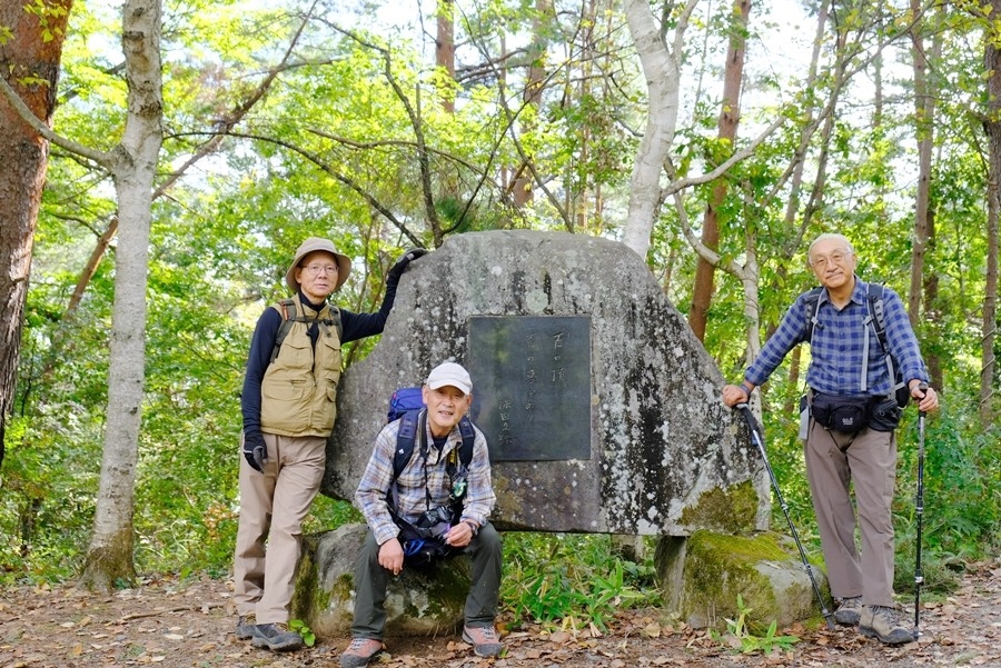 碑の前で男どもが記念撮影。お疲れさんでした。