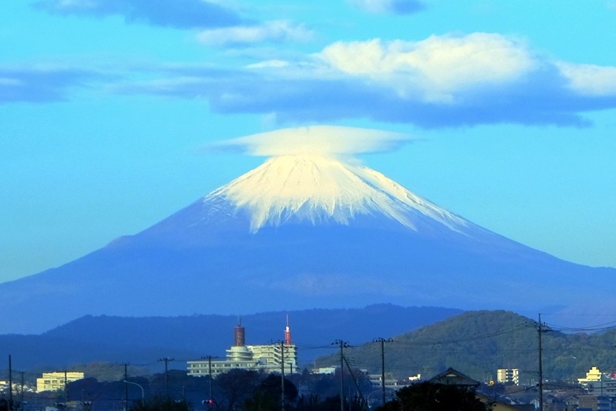 途中の高速道路から、頭に雲を載せた富士山が見えた。