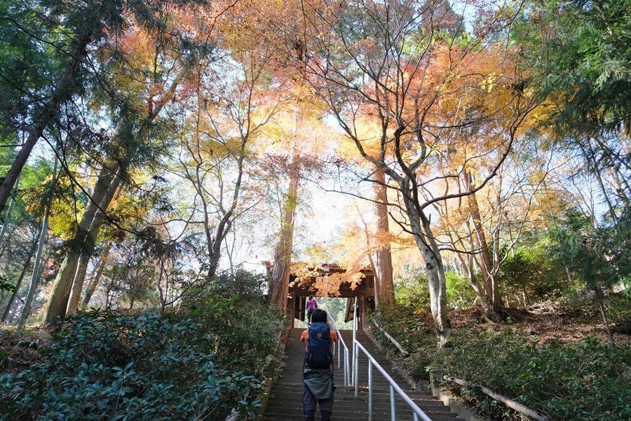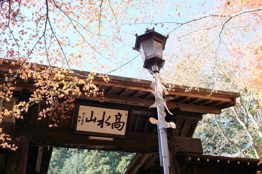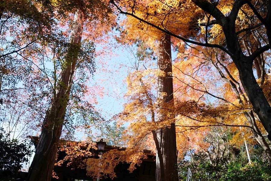 陽差しに輝く紅葉に彩られた常福院の山門