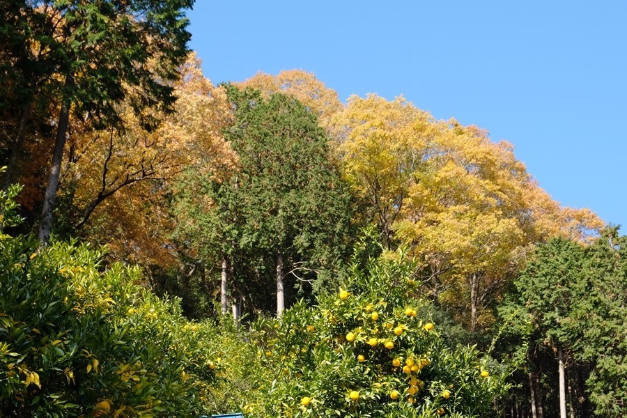 その柚子畑を見上げると黄色く色づいた木々が陽に当たって光っている。