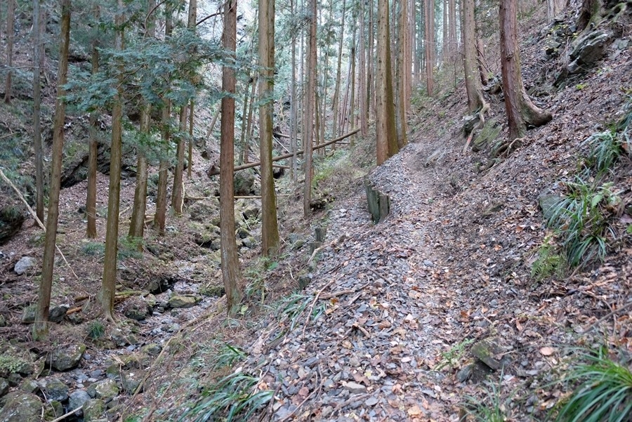 倒木の多い杉林の中を登っていく、結構斜度有り。