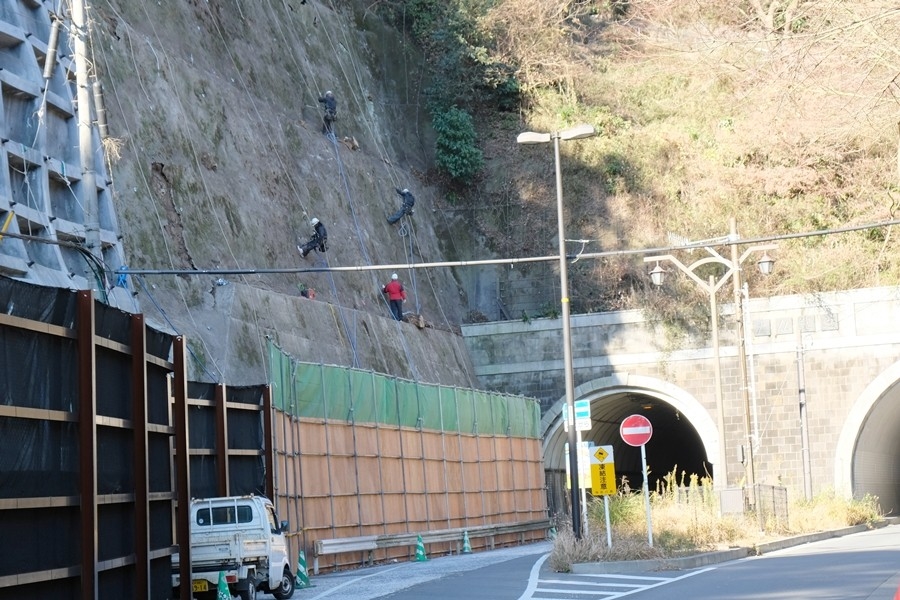 大仏切通の壁が工事中で削岩機の音が鳴り響いている。
