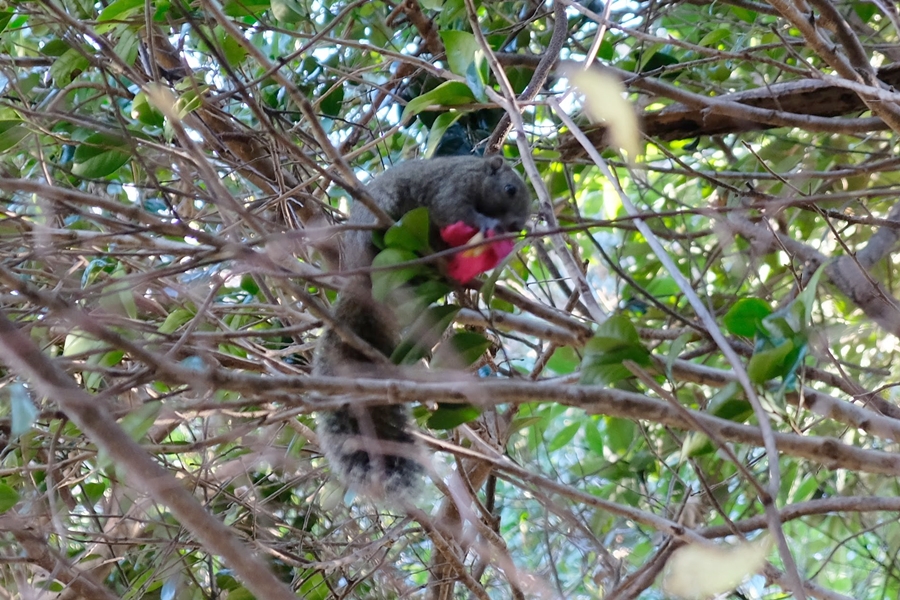 ここではタイワンリスが目の前に現れて、椿の花を樹上で食べる光景に遭遇した。