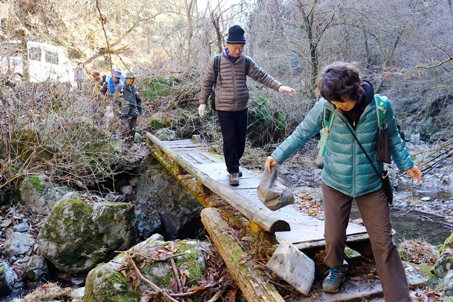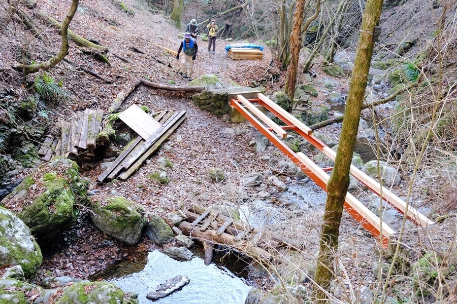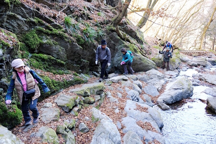 橋の工事中沢を渡る。