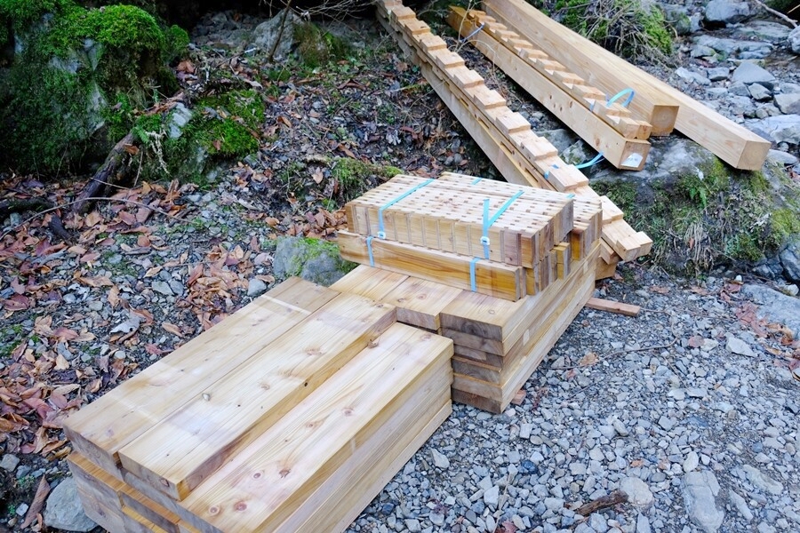 材木があちらこちらに置かれている。