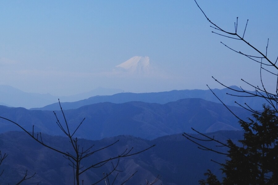 尾根に出た。時々開ける所から、富士山がうっすらと見える。
