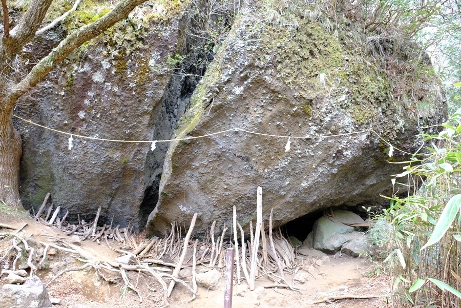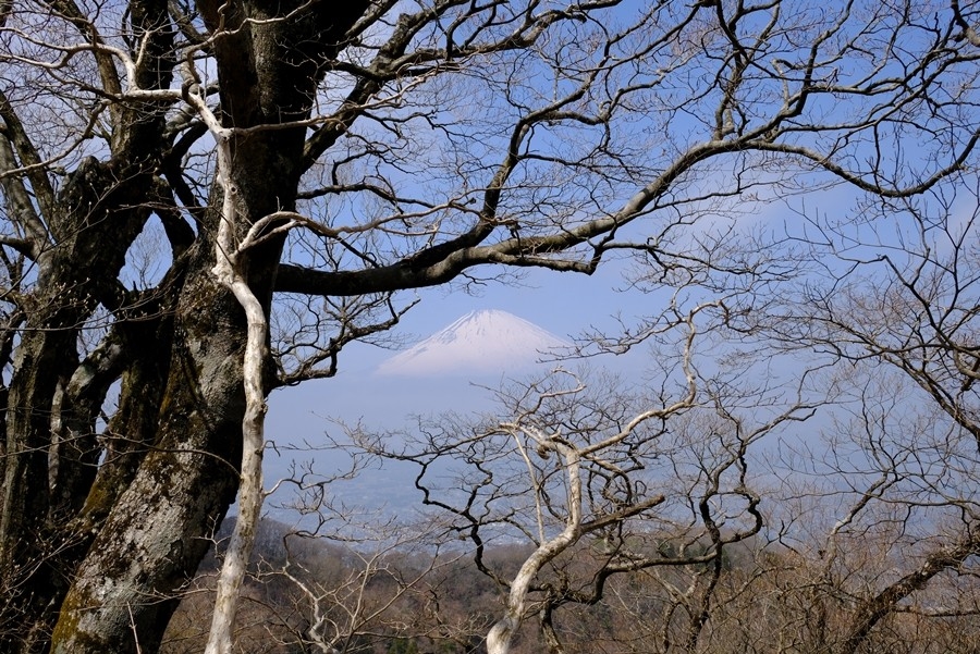 樹間に時々現れる富士山に元気をもらい山頂手前の急な岩の間を進む