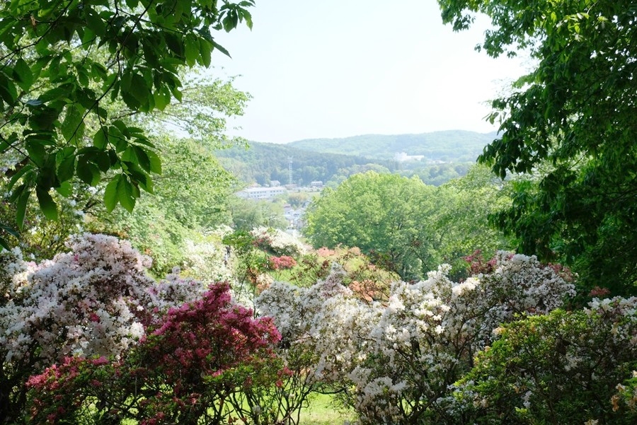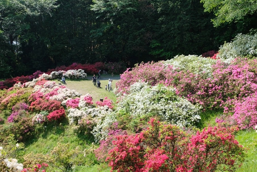 公園の西の端に西山高取へ向かう道があったのでそちらを登り、つつじ公園を上から見る。