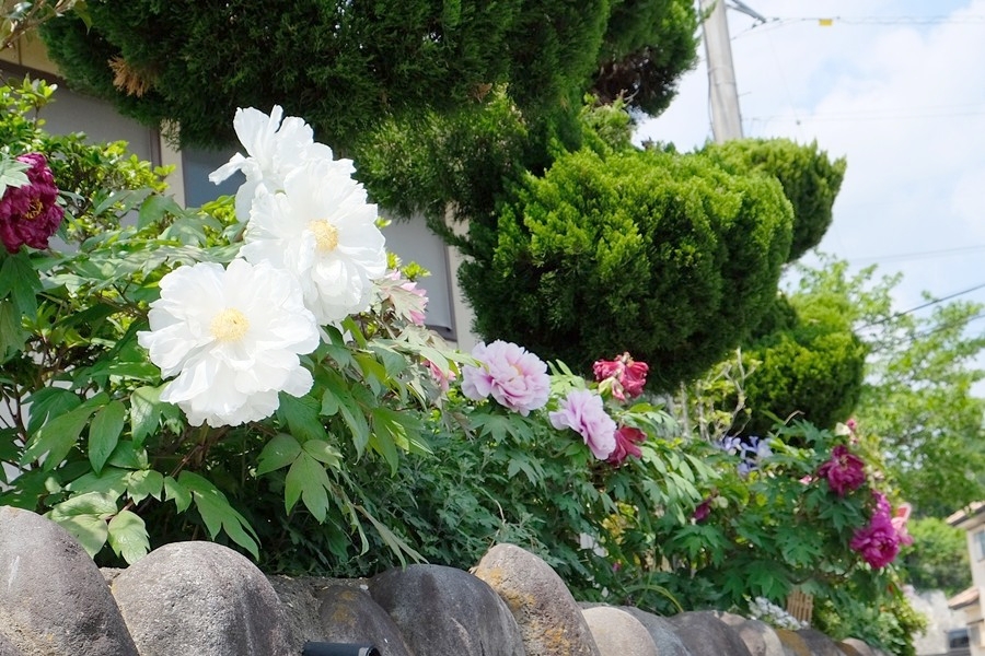 花好きの家が多いようだ。芍薬か多分牡丹が色とりどりに