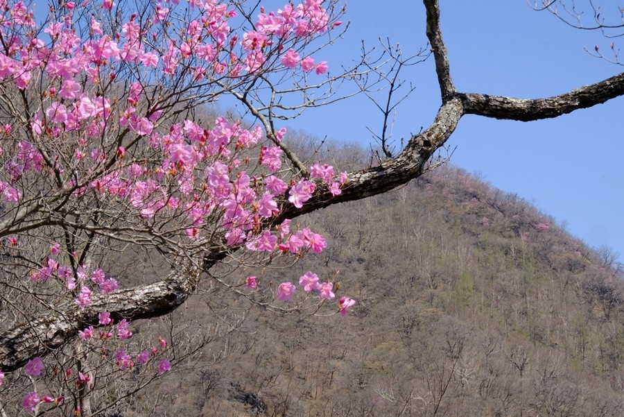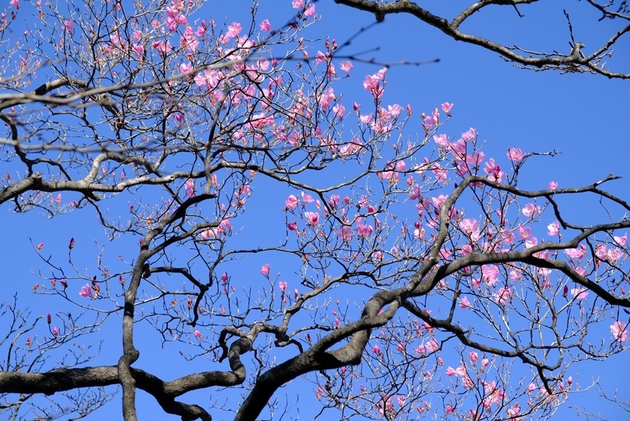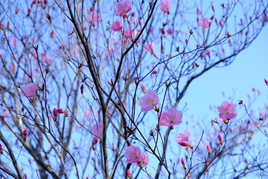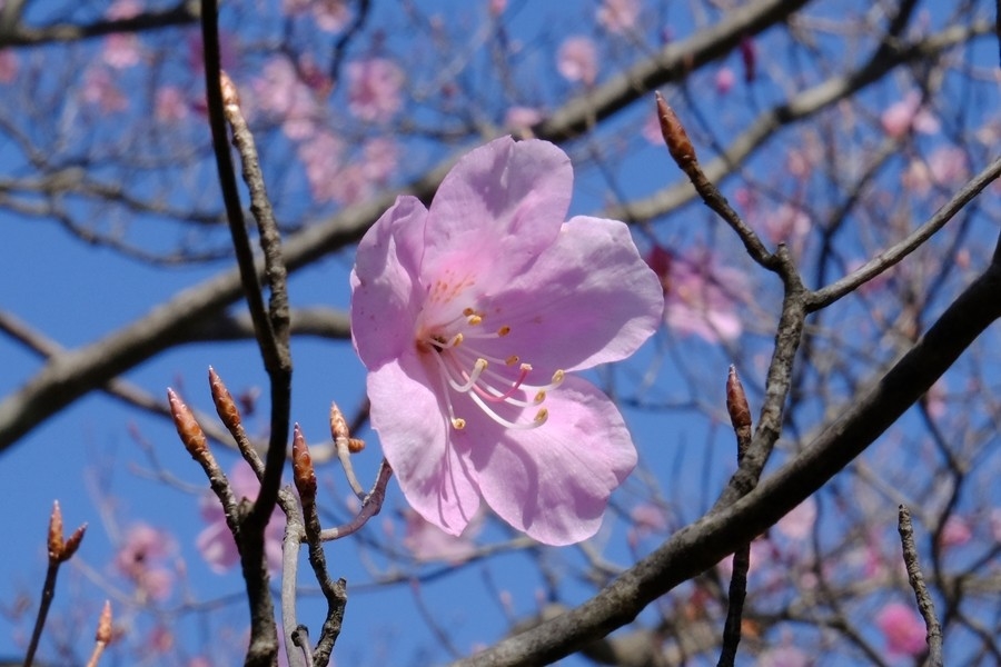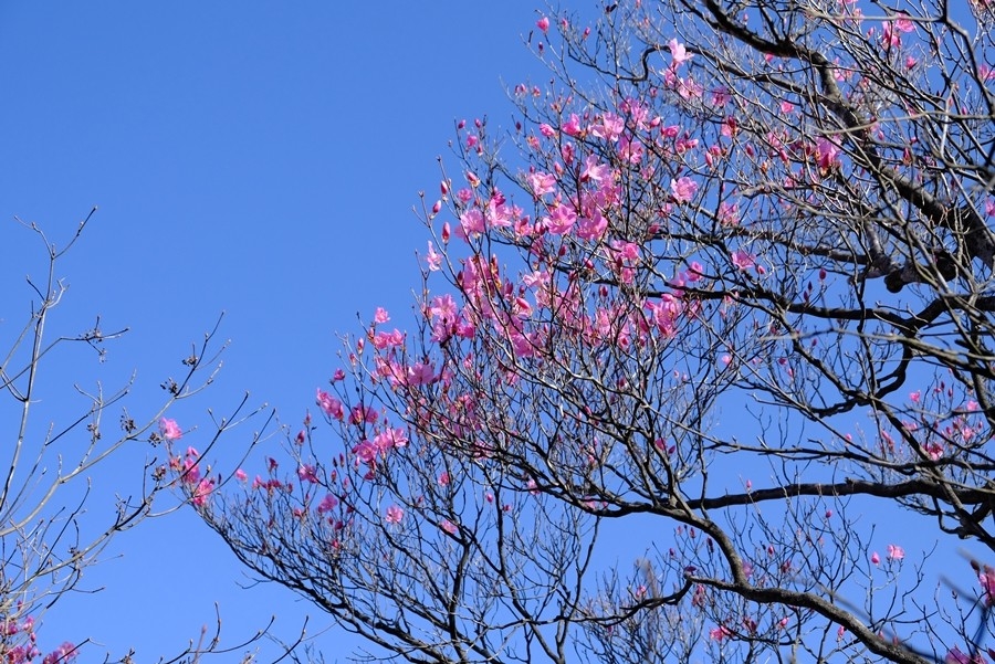大きな木の先に咲いているアカヤシオを見上げるようにしたり、上から見下ろしたりとシャッターを押し続ける。