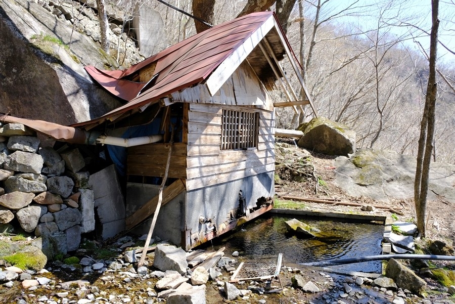 このケーブル跡を渡る所に御神水の看板があり小屋が立っていた。