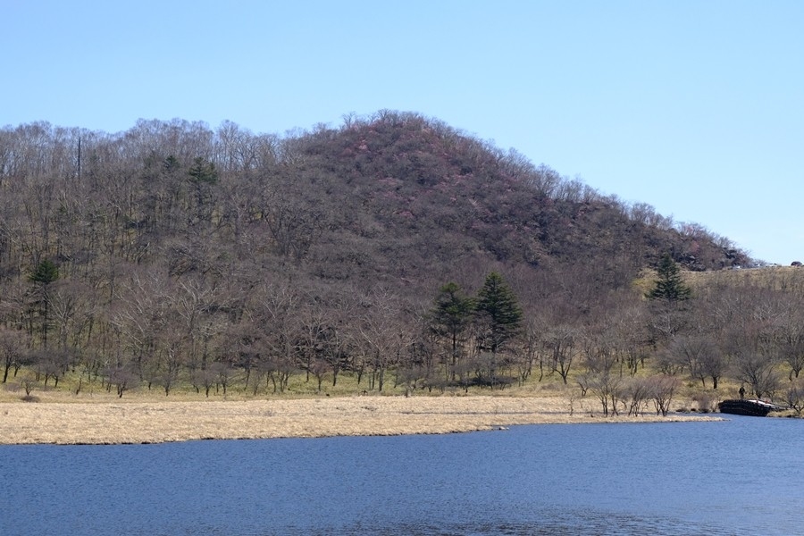 覚満淵越しのアカヤシオの彩られた篭山を見る。